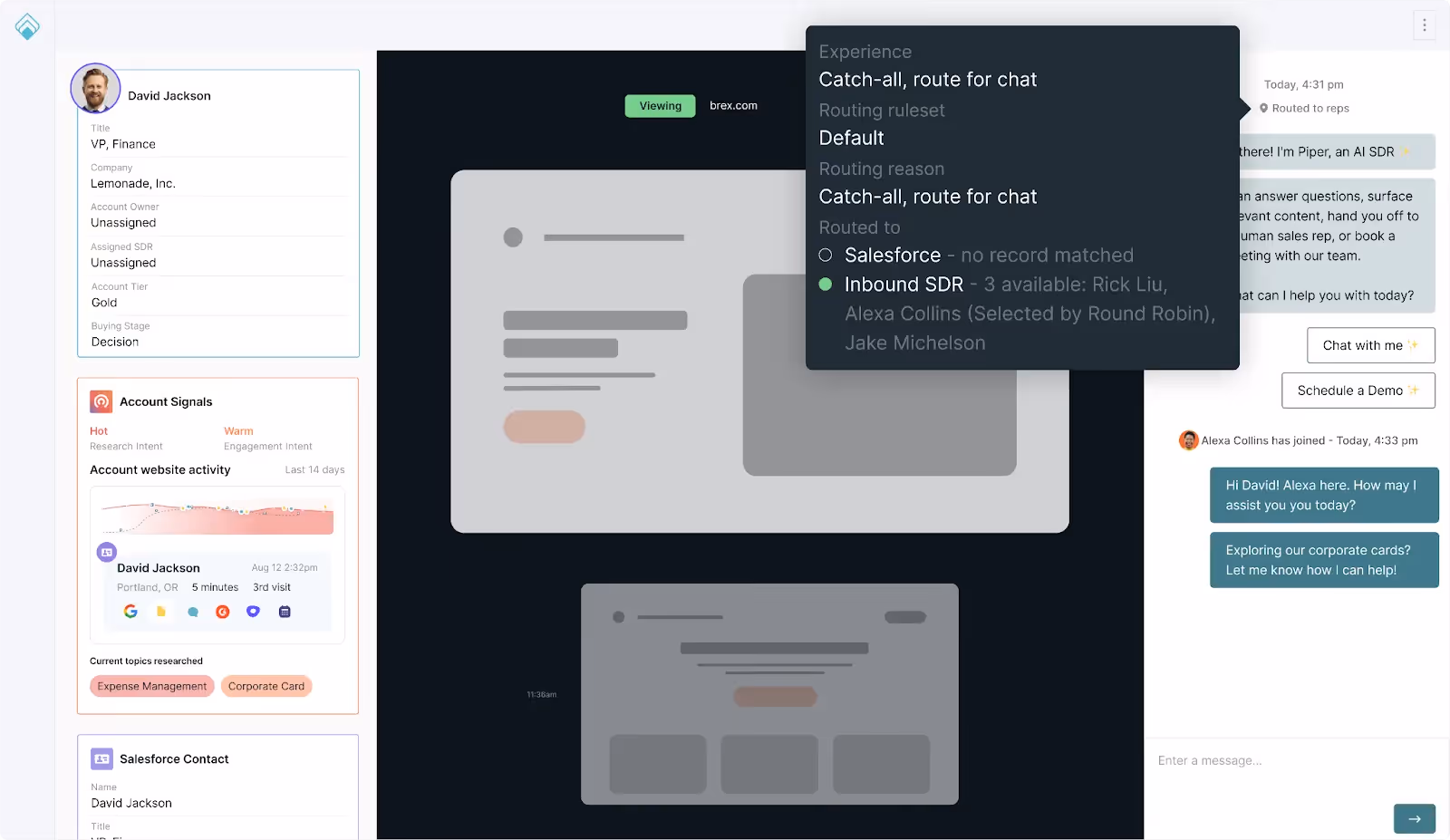 With Piper, your sales reps can have faster, smarter engagements via live chat, voice, or video.