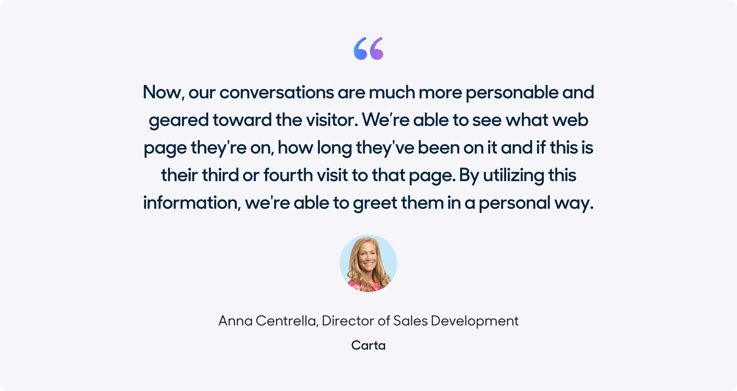 What’s more, this solution had a brittle integration with Salesforce, Carta’s CRM platform. Data from Salesforce wouldn't pull into the platform in real time so Anna's team had to jump back and forth between the two to get a more complete view of their visitors. Doing so hurt both rep efficiency and the visitor experience. As a result, chat dropoff rates were high and the success rate of reps engaging in actual conversations were low. “We were losing these amazing opportunities when someone was actually engaged and interested,” Anna said. “I felt like we were leaving deals on the table.”