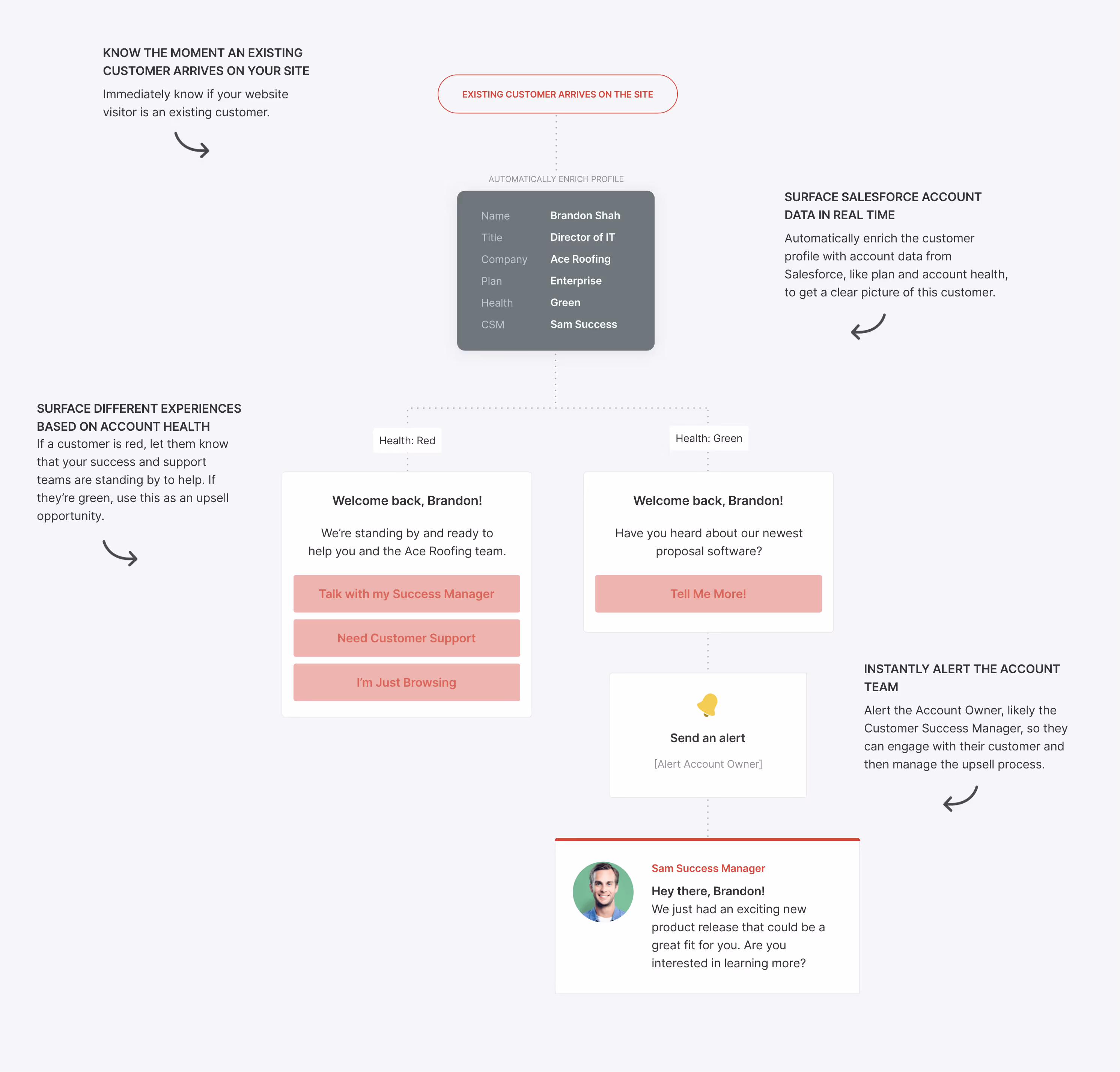 What is it: Selling to your existing customer base is a tried and true path to revenue, but you can't have your sales team dive in straight away. These are valuable customers that need to be treated with the utmost care. The Existing Customer Upsell recognizes when existing customers land on the site and takes a look at few vital pieces of information before serving up experiences. If a customer is a green account, open the door to talk about new services and products that they could benefit from.