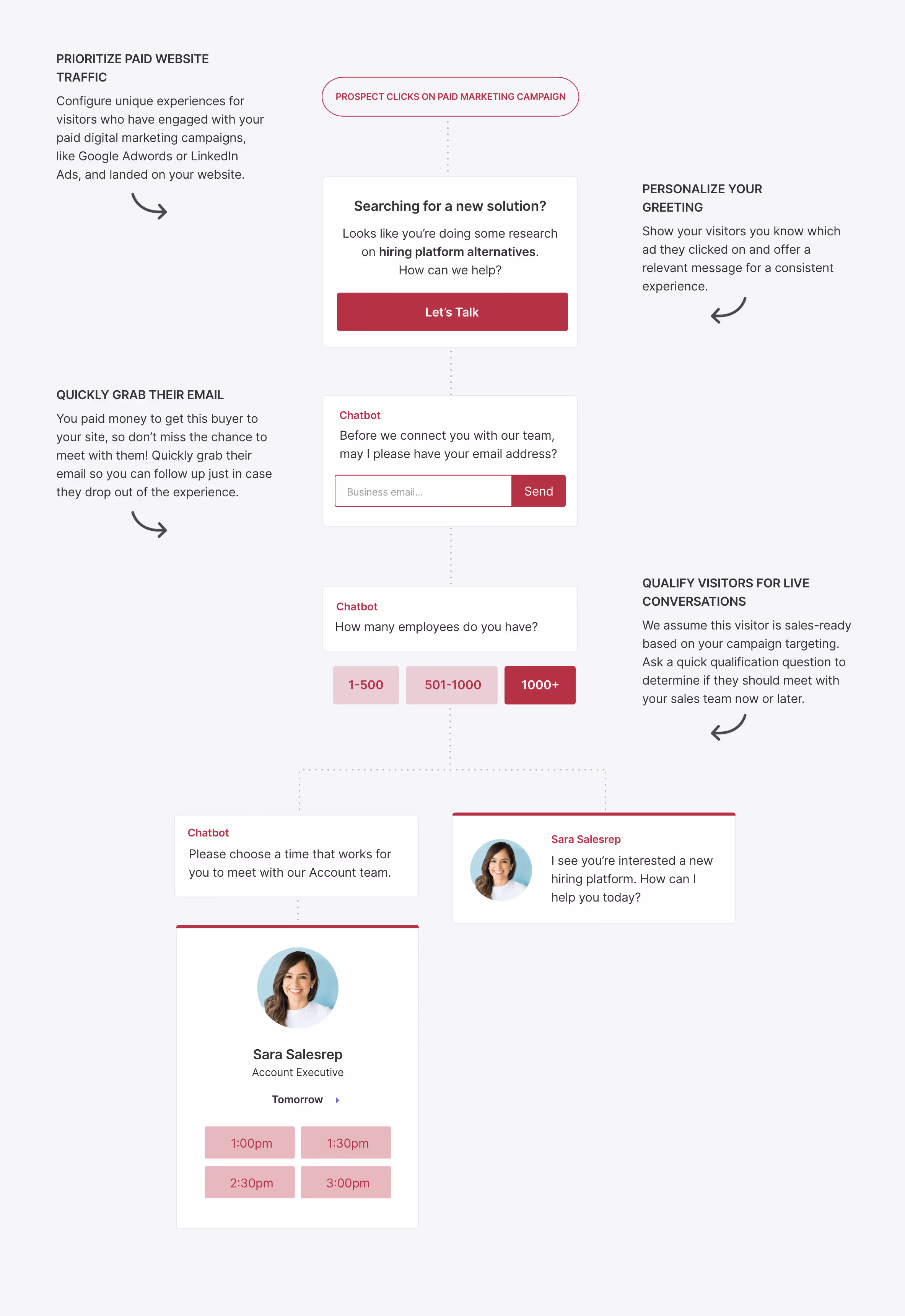 What is it: As a marketer, you spend time and money crafting effective digital marketing campaigns on platforms like Google, LinkedIn, or G2. No matter the platform, the goal is always the same: engage individuals that represent your target customer and drive them to your website. With The Paid Traffic Converter Experience, you immediately know when someone has arrived from a paid advertisement and can greet them with a tailored, real-time sales experience.