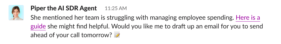 When buyers click through a Gong Engage email, Piper will instantly enrich their profile and determine whether they’re qualified. She’ll then set out to book a meeting with them while their interest is piqued.