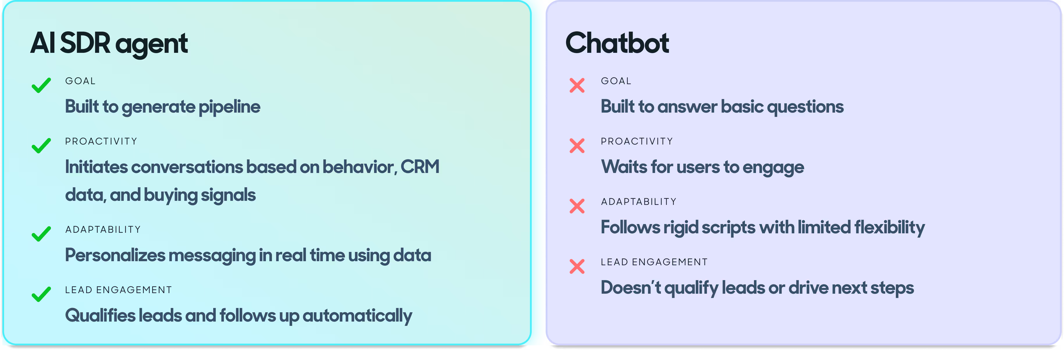 Chatbots might answer questions—but AI agents drive results. In this post, we break down the key differences between rule-based chatbots and AI SDR agents