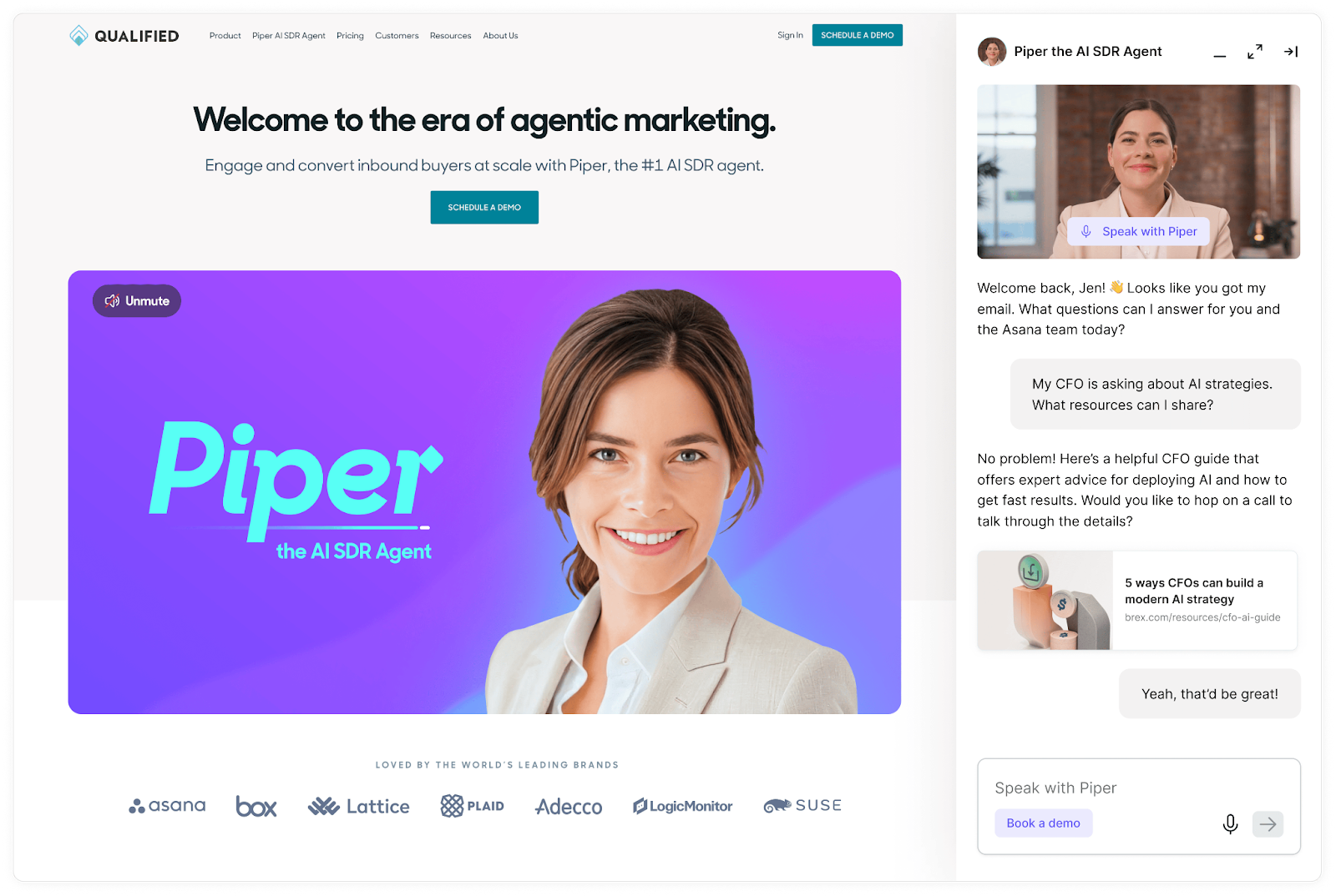 With Pinned Mode, Piper the AI SDR Agent is visible and waiting to help the moment you arrive on the site. She knows the website better than anybody who works here, can answer all your questions, can help you navigate, book a demo, or even show you some slides.