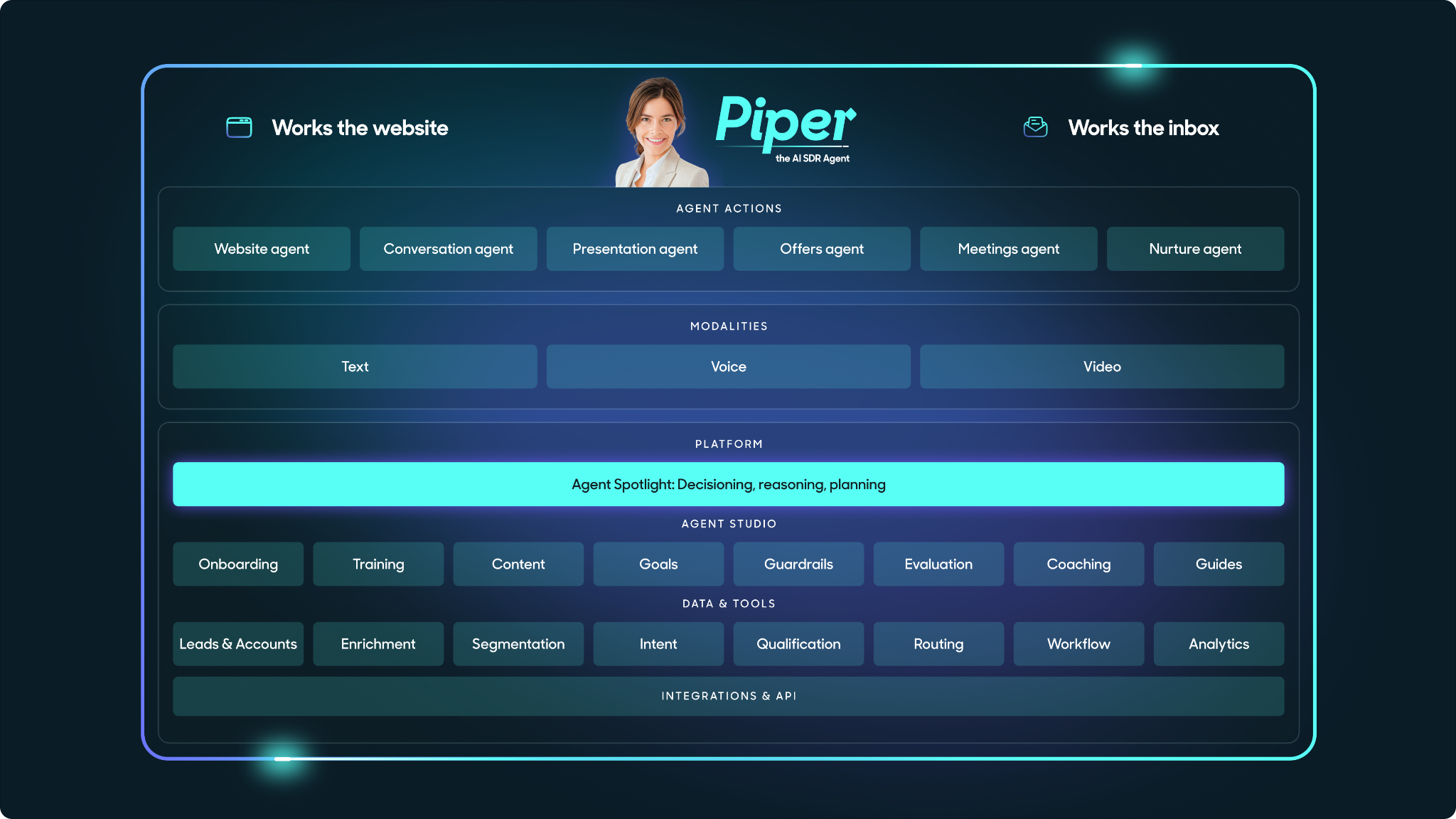 Piper the AI SDR Agent now comes to life on the website and meets with buyers in their preferred format, whether it’s video, voice, or text. She can answer buyer questions, change languages in the moment, instantly qualify buyers, and book meetings on the spot to maximize pipeline. She can also present sales slides when website content isn’t available or relevant to the conversation. Coming soon, she will also be able to co-browse with buyers and guide them around the website to help them find what they need.