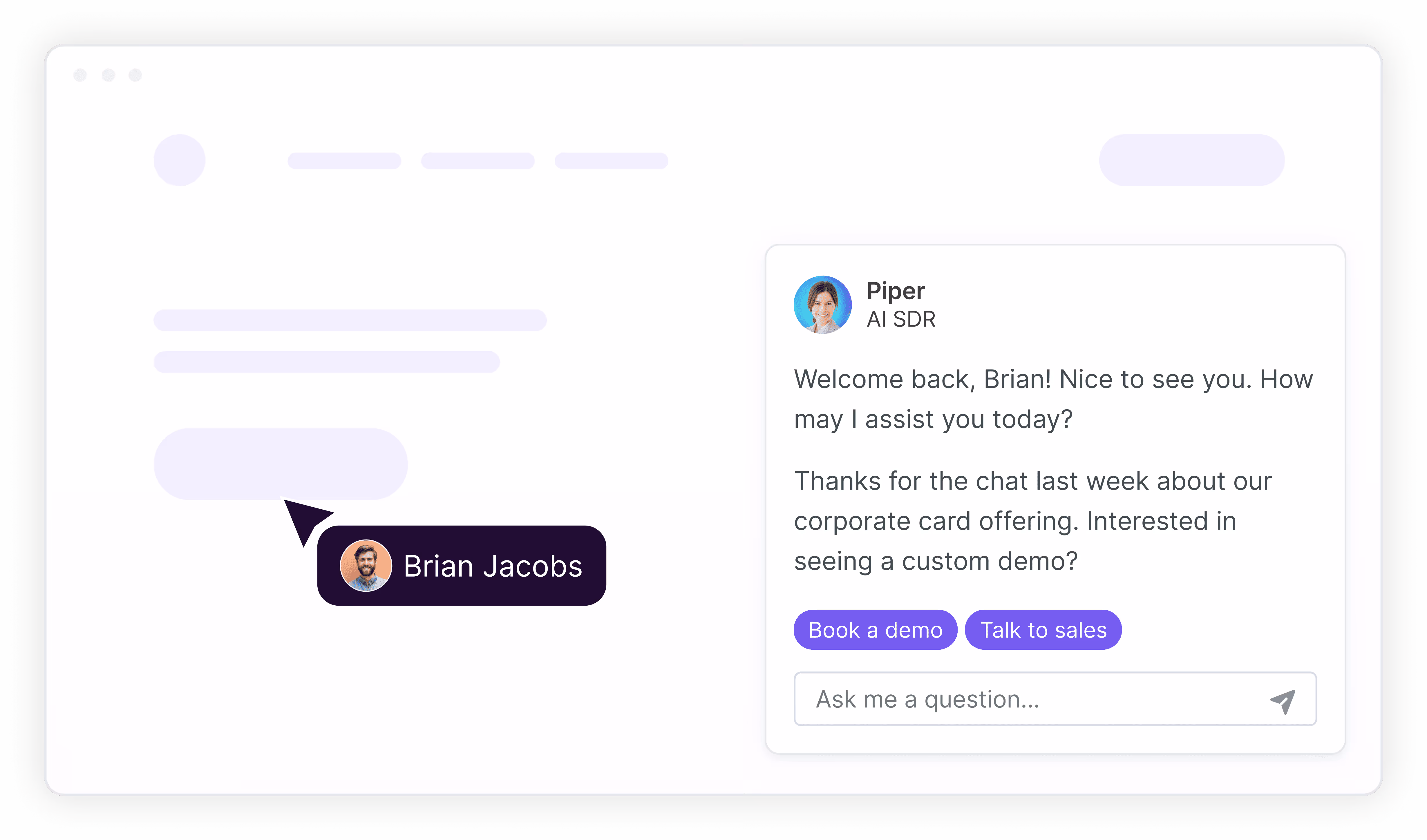 The Piper Pounce design has also been upgraded to include a response box, which makes it easier for the visitor to respond and engage with Piper. The new design also includes embedded buttons to immediately trigger a Piper Goal, like “book a meeting” or “talk with sales,” to expedite the conversation.